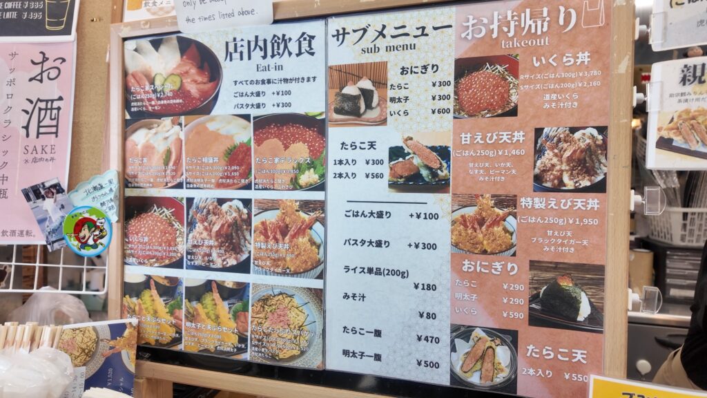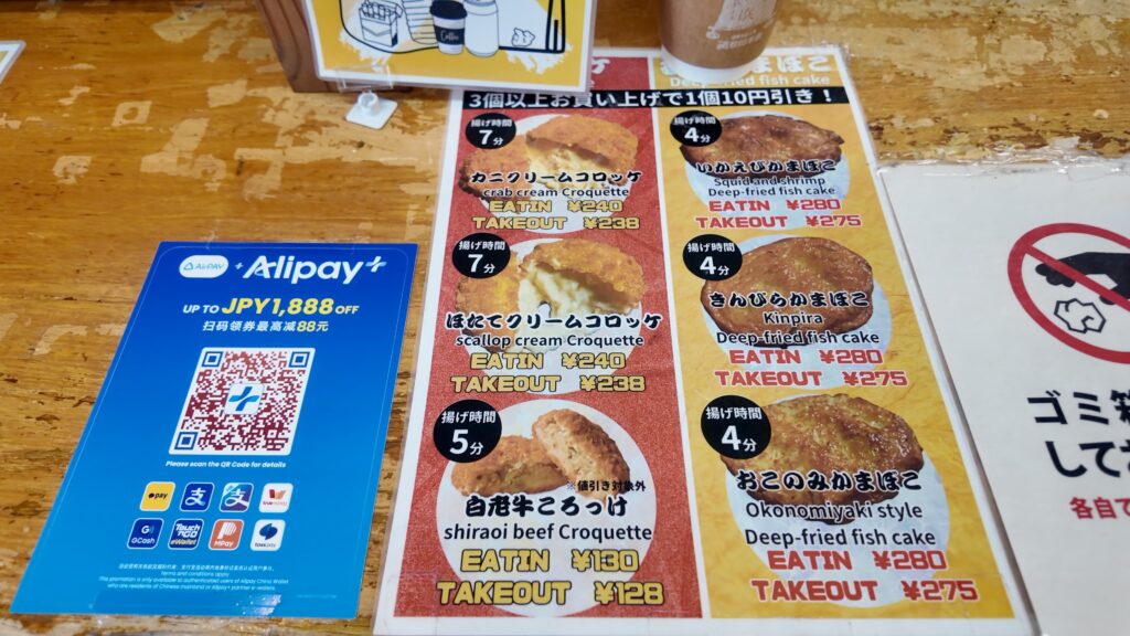 メニューは海鮮丼や天丼などもあり、しっかりと食事を楽しむこともできますし、コロッケなどをテイクアウトし食べ歩きすることもできるのが良いですね。