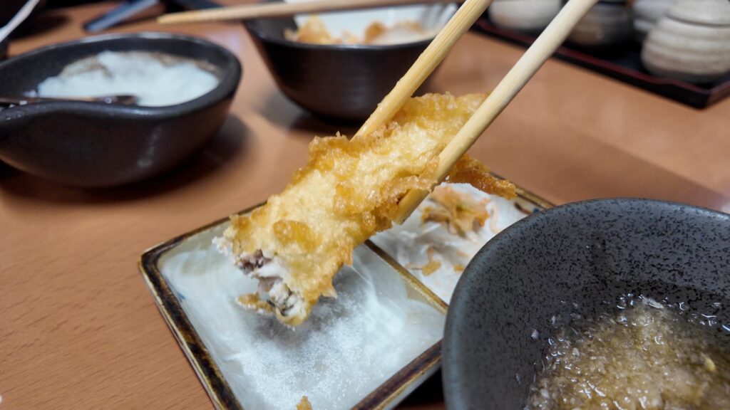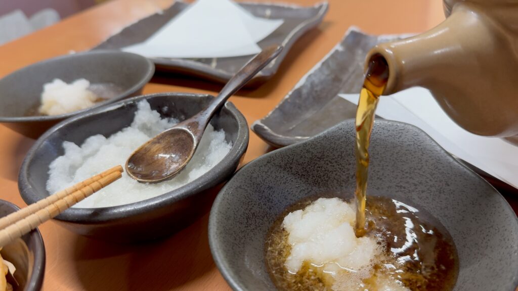 大根おろしたっぷりの天つゆに浸していただいていきます。