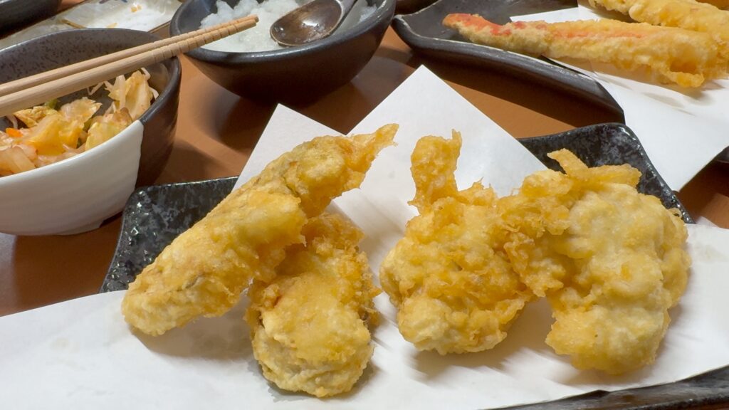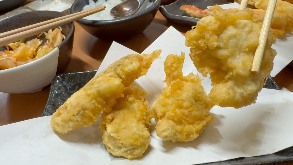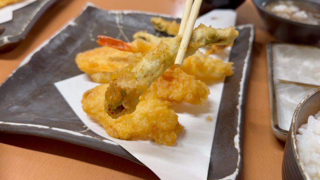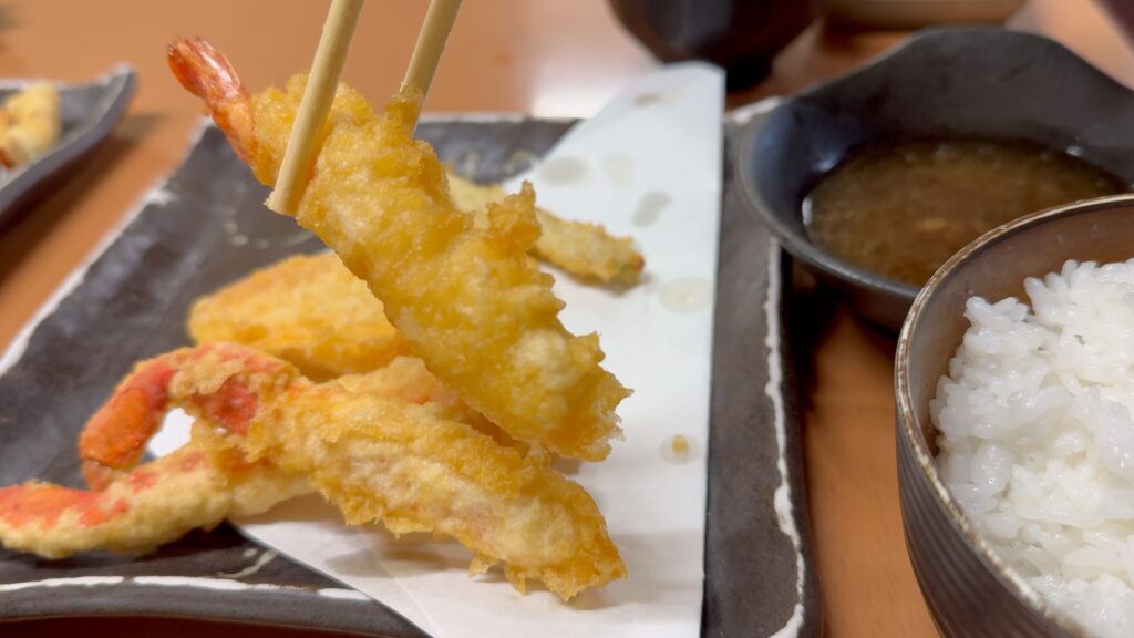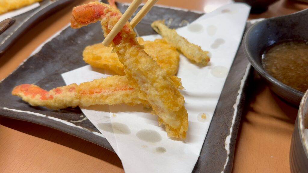 「えび」「かに足」「帆立」「イカ」「ししとう」「なす」の6品の天ぷらが付いた定食になります。