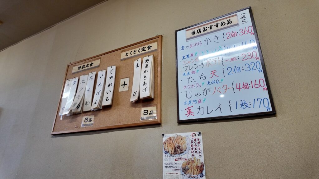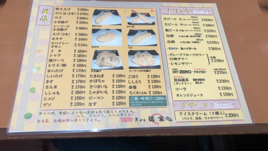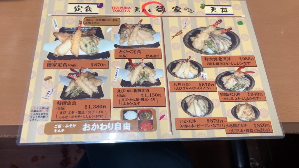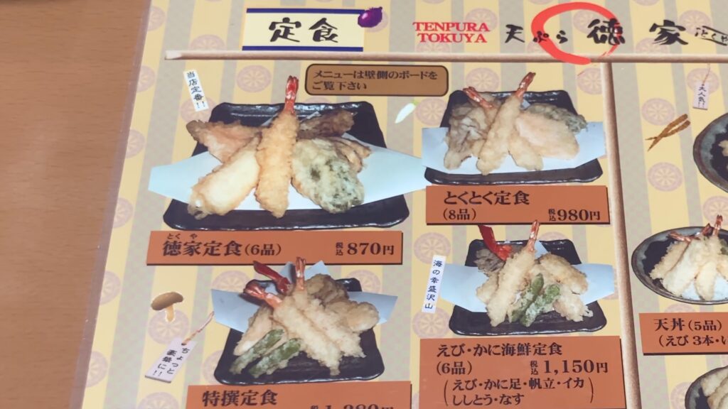 メニューは定食と天丼、そして単品があり、定食・天丼でまず悩んでしまいます。