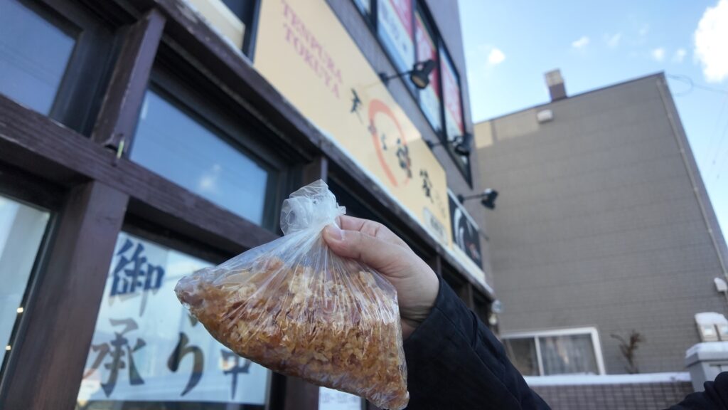 会計時にレジ横に並べられていた無料サービスの天かすもいただきました。