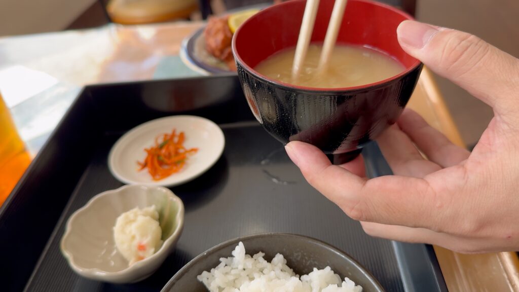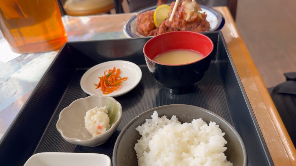 揚げたて熱々のザンギにお味噌汁、ご飯、ポテトサラダに小鉢が二つも付いています。