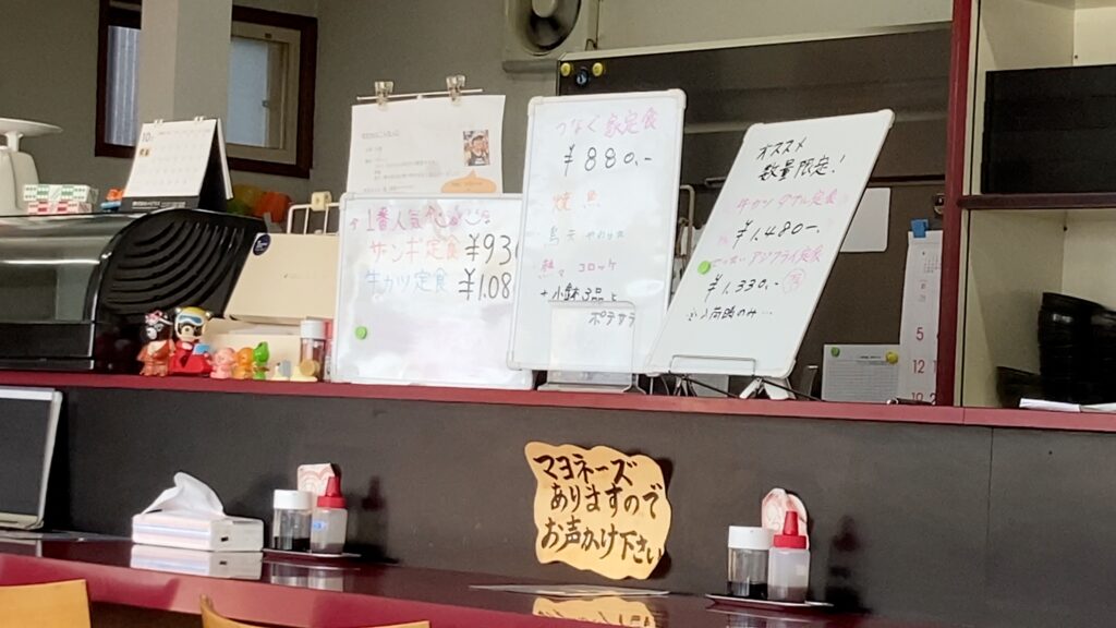 メニューはざんぎやチキンステーキなどお肉系のものからでっかい真ほっけや煮魚などのお魚の定食もあります。
