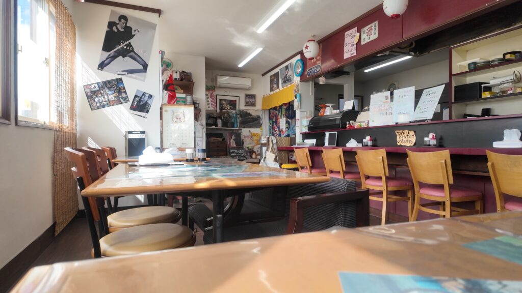 店内はカウンター席とテーブル席、矢沢永吉さんのポスターが良いですね。
