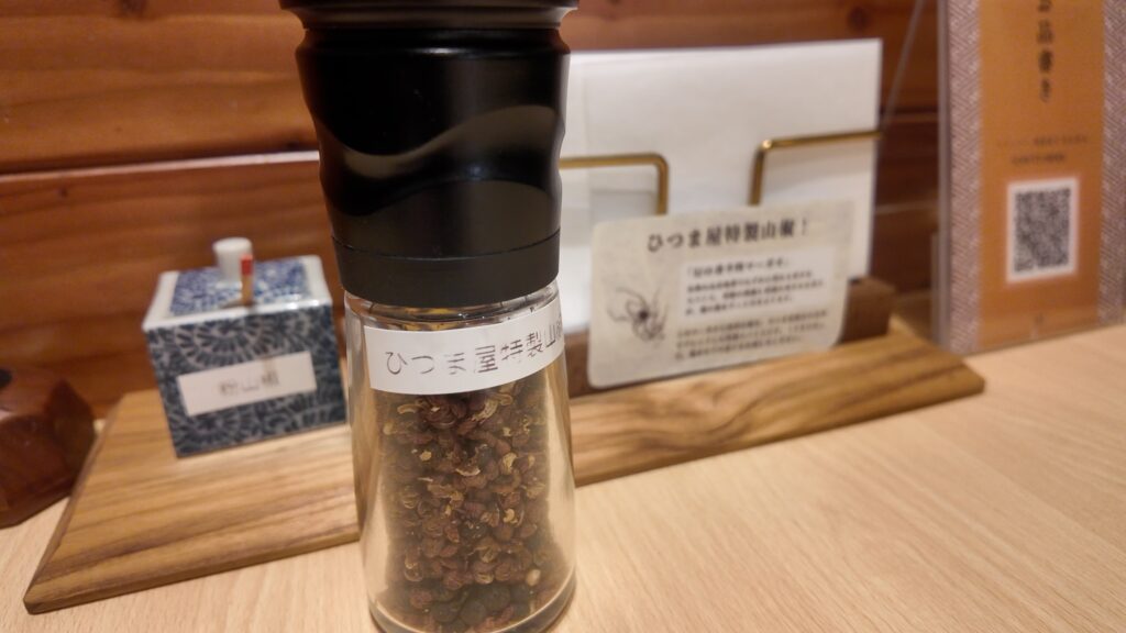 卓上には「幻の香辛料 マーガオ」と国産山椒をブレンドしたひつま屋さん特製山椒と「粉山椒」の二種類の山椒が置かれていました。