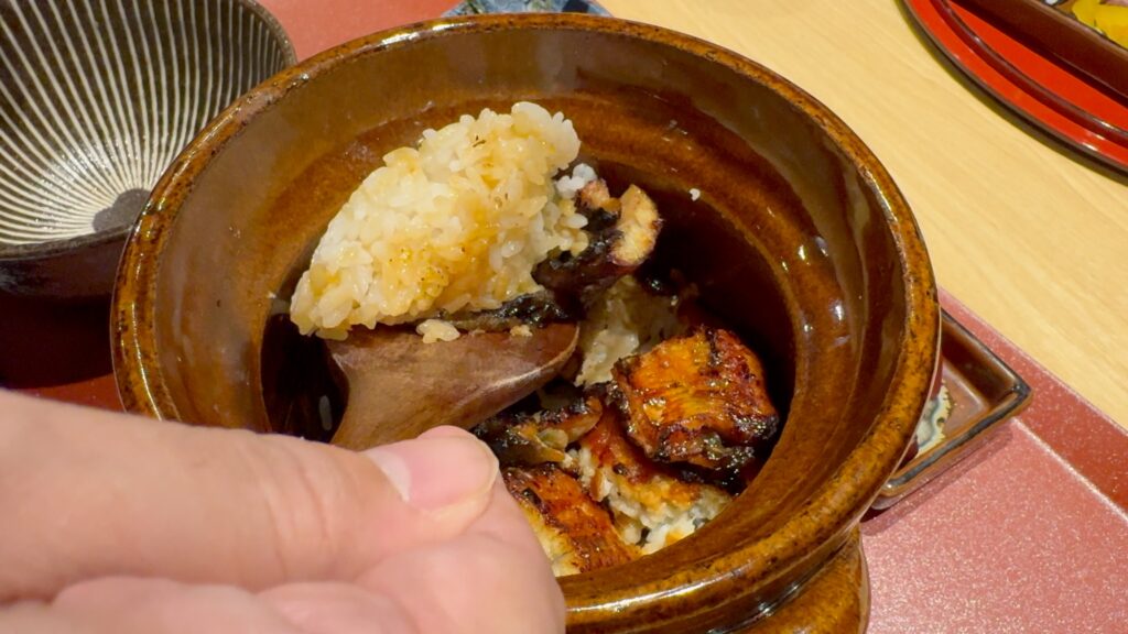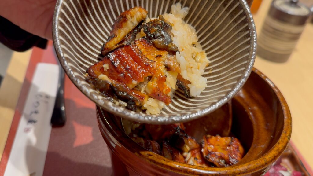 黄金出汁ひつまぶしは特上・上・並の3種類あり、その違いはうなぎの量で一尾・3/4尾・半尾なのだそうです。こちらは上なので3/4尾になります。