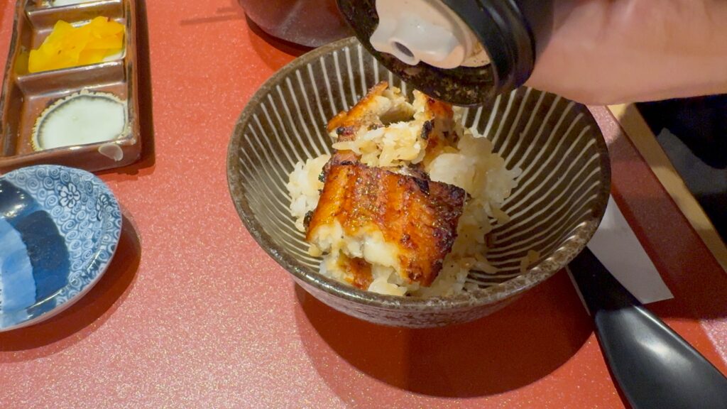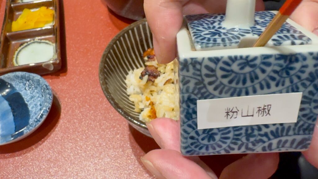 もう半分にひつま屋さん特製山椒を振っていきます。