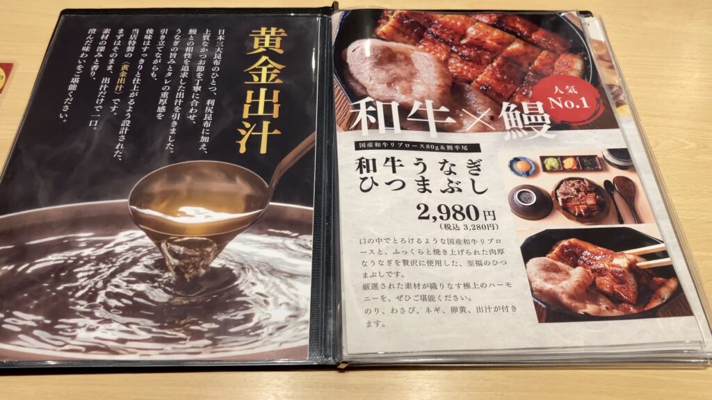 鰻の他に和牛も提供されていて、人気No1は和牛と鰻の「和牛うなぎひつまぶし」「ひつまぶし」は黄金出汁でいただけるとのこと。黄金出汁気になりますね。